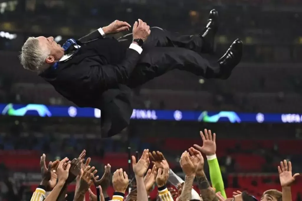 | Carlo Ancelotti projeté en l'air par ses joueurs, le 1er juin au stade de Wembley à Londres. |