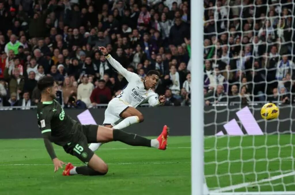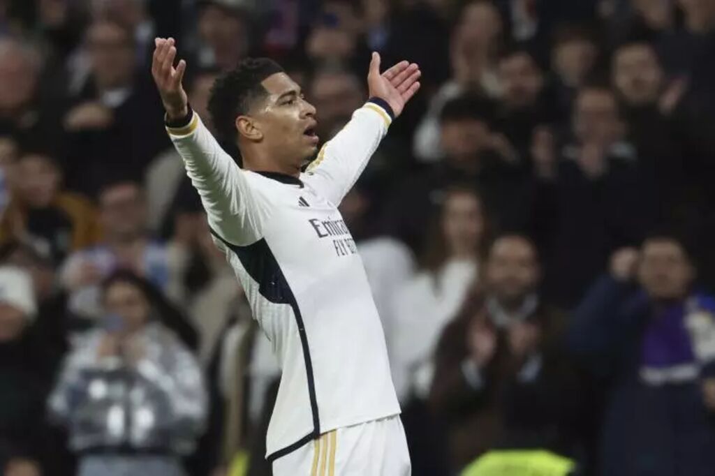 | Jude Bellingham inscrit le deuxième but du Real lors de la victoire 4-0 de son équipe face à Gérone, le 10 février à Madrid. |