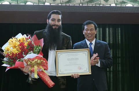 | Le réalisateur du film «Kong: Skull Island», Jordan Vogt-Roberts (gauche), et le ministre de la Culture, des Sports et du Tourisme, Nguyên Ngoc Thiên, le 13 mars à Hanoï. |
