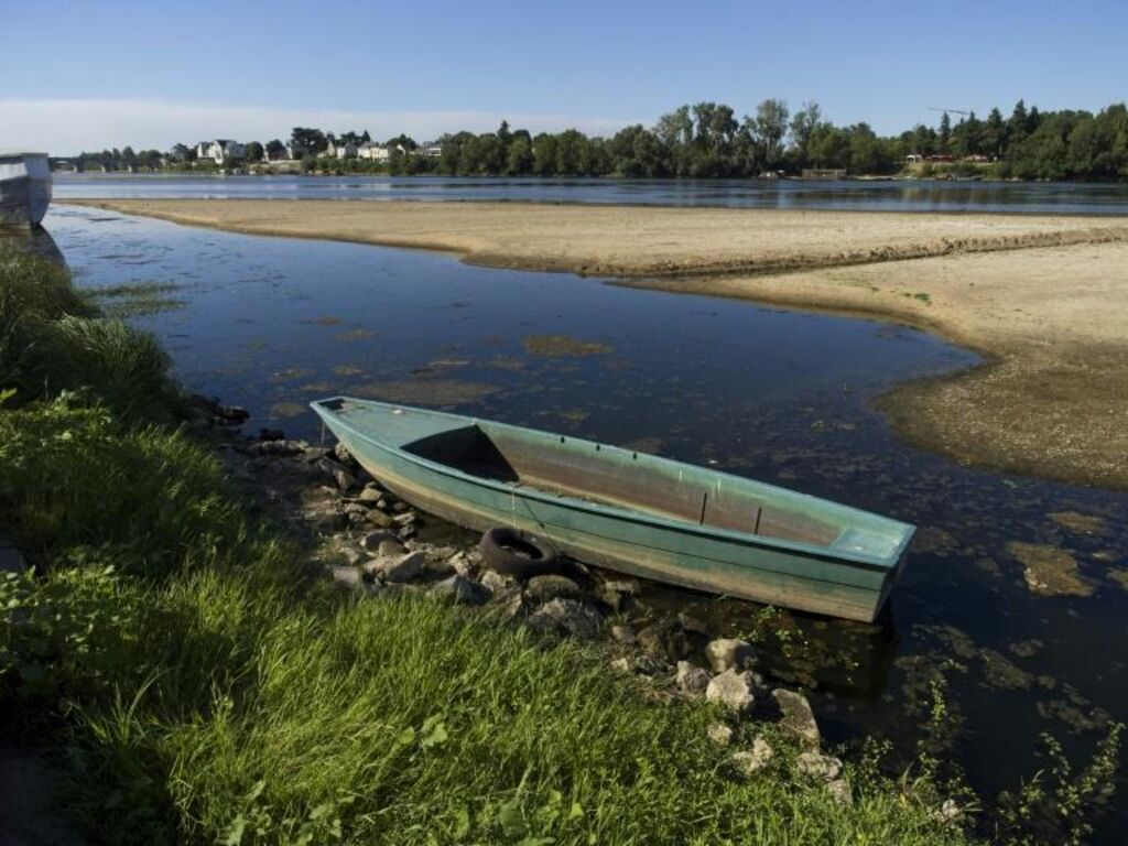 | La Loire à son niveau le plus bas le 8 août 2022 à Saumur, Ouest de la France, à cause d'un épisode caniculaire. |