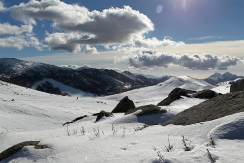 | Sommets enneigés de la station de ski du val d'Ese à Bastelica, en Corse-du-Sud. |