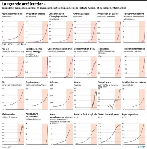 | Indicateurs de la "grande accélération", phénomène d'évolution de plus en plus rapide de l'activité humaine et du climat depuis les années 1950. |