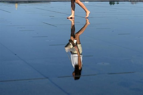 | Reflet d'une femme sur le mirroir d'eau dans le centre de Bordeaux où la population vient se rafraîchir, le 19 juin. |