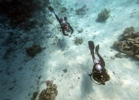 | Des plongeurs au large de la cité balnéaire de Hourghada, dans l'Est de l'Égypte, le 4 avril. |