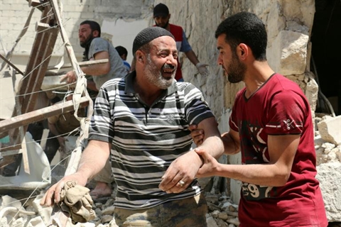| Détresse des habitants après des bombardements dans le quartier al-Kalasa tenu par des rebelles, à Alep, le 28 avril. |