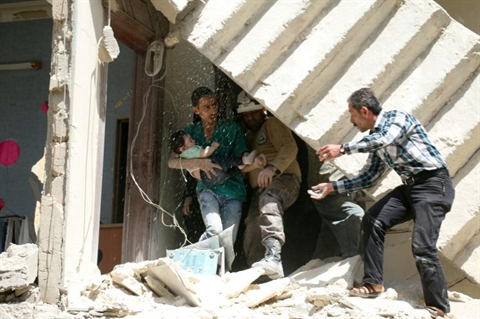 | Des Syriens évacuent un bébé des décombres après les bombardements sur le quartier d'Alep, al-Kasala tenu par les rebelles, le 28 avril. |
