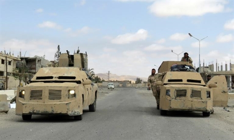 | Des membres des forces syriennes dans des blindés à Palmyre, le 27 mars. |