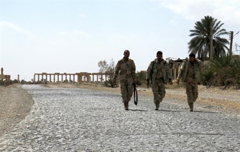 | Des soldats syriens après avoir repris Palmyre au groupe État islamique, le 27 mars |