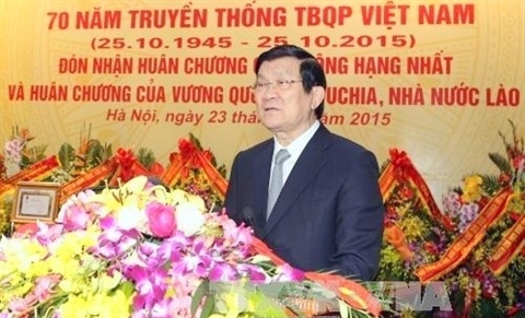 | Le président Truong Tân Sang prend la parole lors de la cérémonie de célébration du 70e anniversaire de la Journée traditionnelle du Département général du renseignement, le 23 octobre à Hanoi. |