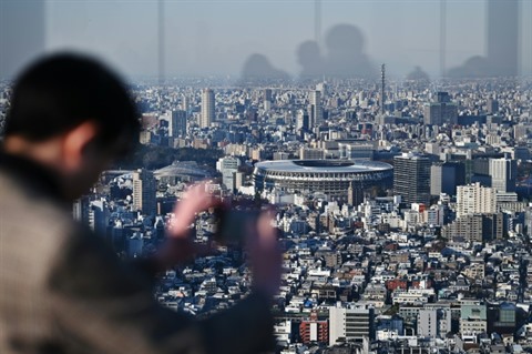| Un homme regarde le stade national récemment construit pour les JO, le 25 mars, à Tokyo. |