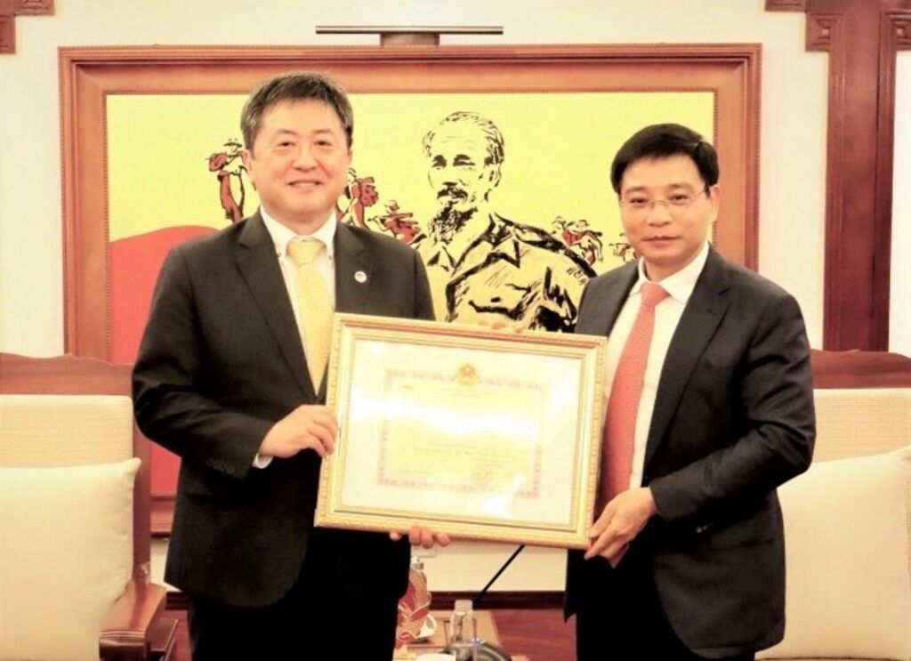 | Le ministre Nguyên Van Thang (droite) remet l'insigne au représentant en chef de JICA au Vietnam, Shimizu Akira, le 23 mars à Hanoï. |
