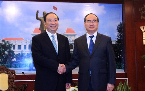 | Nguyên Thiên Nhân (droite) et Huang Kunming, le 6 juillet à Hô Chi Minh-Ville. |