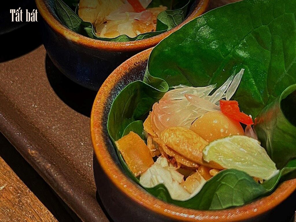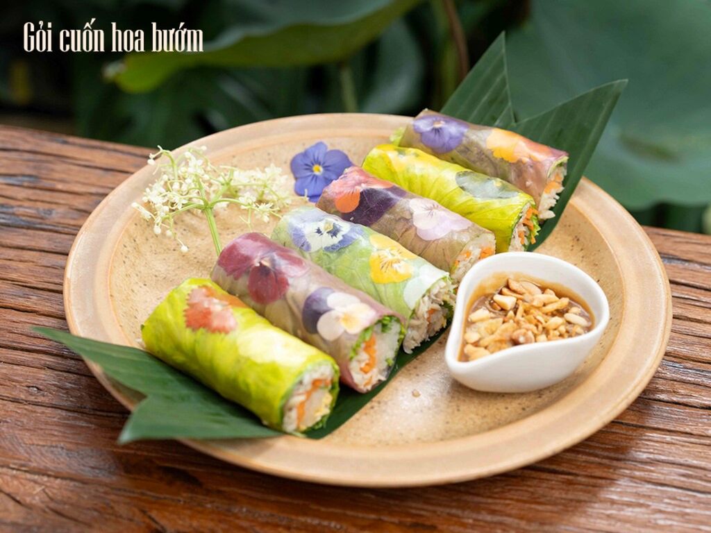 Parmi les plats emblématiques on retrouve le Tất Bát, version végétarienne du miang kham thaïlandais, présenté dans des feuilles de lolot avec pamplemousse, noix de coco séchée et noix de macadamia grillées ; les rouleaux de printemps “papillon”, décorés de fleurs comestibles et des légumes frais ; et le plateau de nems carrés végétariens, inspiré des nems de crabe de Hai Phong, revisités avec champignons, vermicelles et légumes sautés.