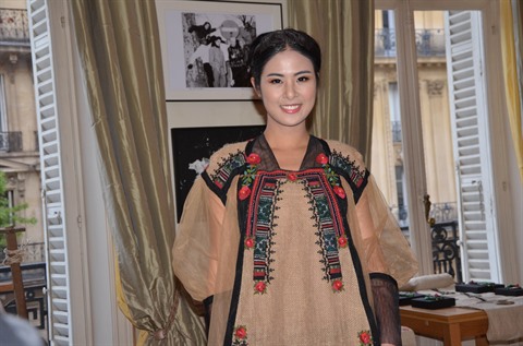| Miss Vietnam 2010, Ngoc Hân, portant une blouse en brocart à la «Journée du Vietnam» à Paris, le 19 septembre 2016. |