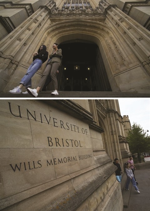 | Des étudiants à l’entrée d’un bâtiment de l’Université de Bristol, |