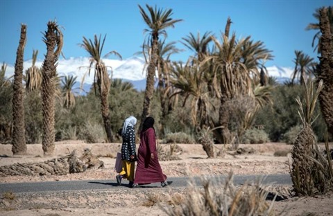 | Photo prise le 27 janvier montrant des femmes marché dans l'oasis de Skoura, dans le Sud-Est du Maroc, menacée d'extinction par le dérèglement climatique. |
