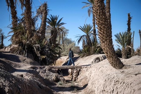 | Un homme emprunte le 27 janvier un pont enjambant un ruisseau asséché dans l'oasis of Skoura, dans le Sud-Est du Maroc, menacée d'extinction par le dérèglement climatique. |