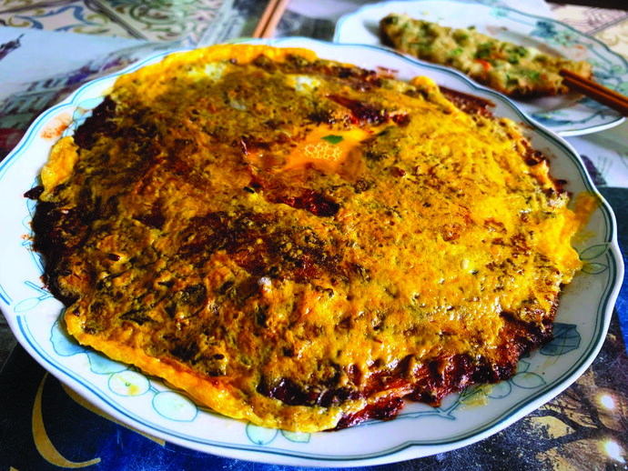 - L’omelette à la vapeur est composée de champignons noirs séchés, de viande de porc hachée... Avant de servir, coupez-la en morceaux rectangulaires.