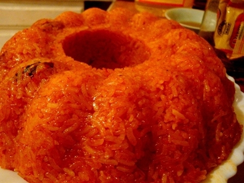 | Le xôi gâc (riz gluant à la momordique) présente une belle couleur orange. |