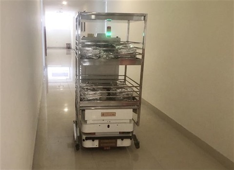 | Un robot VIBOT utilisé dans un hôpital à Hanoï pour distribuer des plateaux-repas aux patients. |