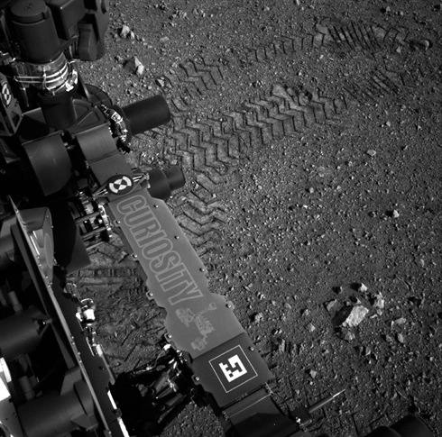 Une photo prise par Curiosity depuis sa nouvelle position montre clairement les traces de ses roues sur le sol martien, et les marques circulaires laissées par les rétrofusées de la "grue aérienne" qui l'a déposé sur la Planète Rouge.