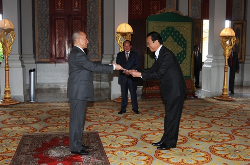 | L'ambassadeur du Vietnam au Cambodge, Thach Du (droite), remet ses lettres de créance au roi cambodgien Norodom Sihamoni, le 21 août à Phnom Penh. |