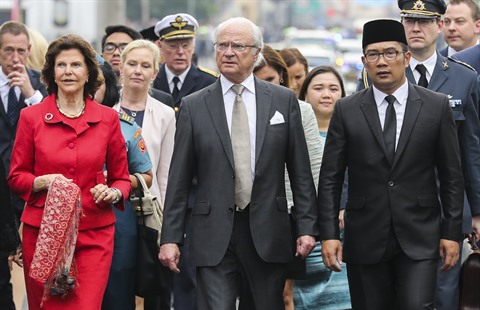 | Le roi de Suède Carl XVI Gustaf (centre) et la reine Silvia (gauche) visitent Bangdung en compagnie du maire de la ville Ridwan Kamil, le 24 mai. |