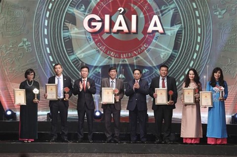 | Cérémonie de remise des Prix nationaux de la presse sur l’édification du Parti 2021, appelés "Búa liêm vàng" (Marteau et Faucille d’or). |