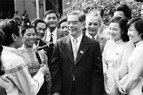 | Le secrétaire général du PCV, Nguyên Van Linh, entouré de délégués du VIe Congrès national du Parti, du 15 au 18 décembre 1986 à Hanoi. |