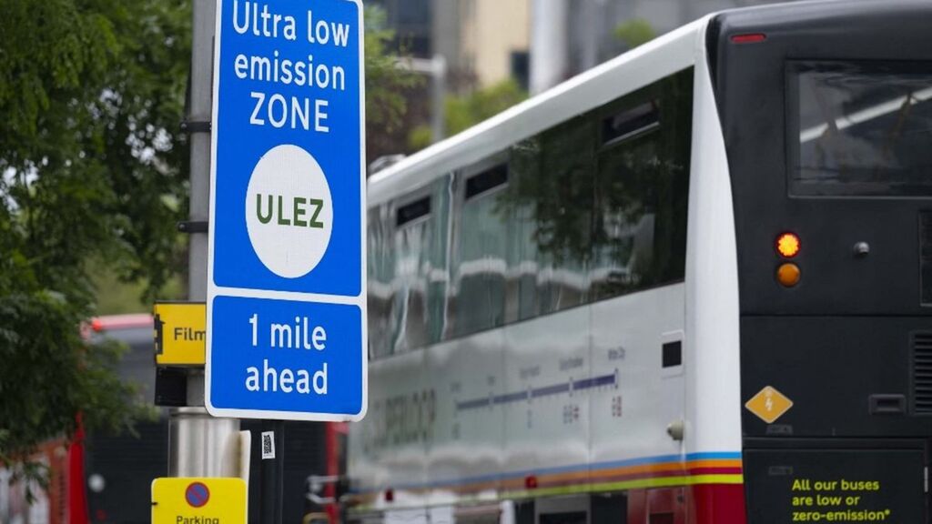 | Un panneau indiquant une zone à faible émissions de CO2 à Londres, le 4 août 2023 en Angleterre. |