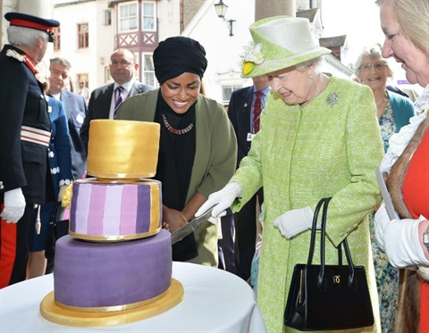| La reine Elizabeth coupe un gâteau, préparé par Nadiya Hussein (gauche), gagnante d'un concours de pâtisserie, lors d'une sortie le jour de ses 90 ans, le 21 avril |