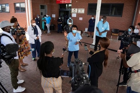 | Nomafrench Mbombo (centre), ministre de la Santé de la province sud-africaine du Cap-Occidental, s'exprime devant des journalistes, au Cap, le 29 décembre 2020. |