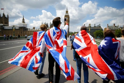 | Des gens marchent sur le pont de Westminster enveloppés dans des drapeaux de l'Union Jack, le 26 juin à Londres. |