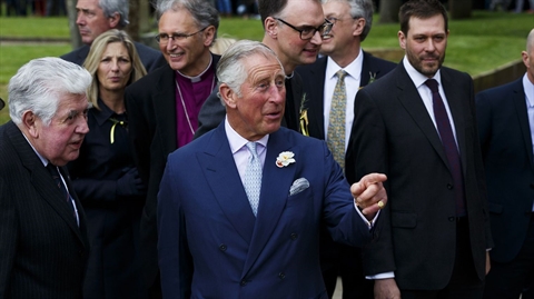 | Le prince Charles (centre) devant l'église de la Sainte Trinité à Stratford-upon-Avon dans le Centre de l'Angleterre, le 23 avril. |