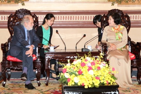 | La vice-présidente du Comité populaire de Hô Chi Minh-Ville, Nguyên Thi Hông, reçoit David Puttnam lors de sa visite au Vietnam en janvier 2015. |