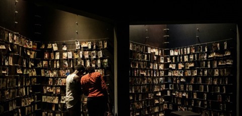 | Des visiteurs regardent des portraits de victimes du génocide de 1994 au Rwanda, exposés au Mémorial du génocide à Kigali, le 29 avril 2018. |