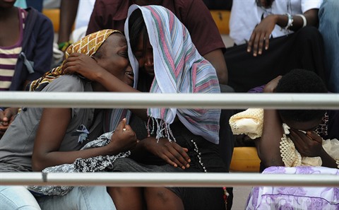 | Des femmes en pleurs lors de la cérémonie du 20e anniversaire du génocide de 1994 au Rwanda, au Stade Amahoro de Kigali, le 7 avril 2014. |