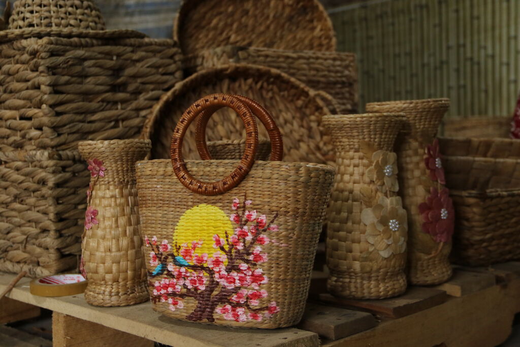 Les matières premières sont extraites des tiges de jacinthes d'eau poussant dans les vasières proches du village et le long de la rivière. Le séchage au soleil dure en moyenne cinq à sept jours. Les artisans tissent les fibres de la jacinthe d'eau sur un cadre disponible qui correspond au produit qu'ils désirent. Outre les produits simples, les artisans ont créé des produits de mode tels que paniers ou chapeaux, qui sont devenus très populaires sur le marché.