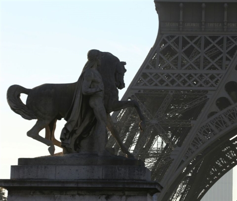 | La statue du "Cavalier arabe", œuvre du sulpteur français Jean-Jacques Feuchère, sur le pont d'Iena à Paris, au pied de la tour Eiffel, le 2 septembre 2015. |
