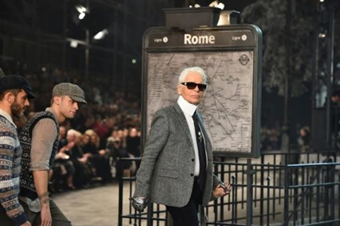 | Le styliste Karl Lagerfeld lors du défilé Chanel à Rome, dans le cadre du mythique studio 5 de Fellini à Cinecittà, le 1er décembre. |