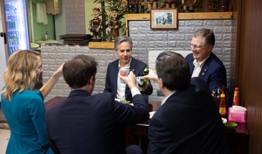 Dans la soirée du 15 avril, le secrétaire d’État américain et son entourage se sont promenés dans le Vieux quartier de Hanoï, ont écouté de la musique dans un club de jazz et ont dîné dans un restaurant vietnamien de la rue Tràng Tiên.