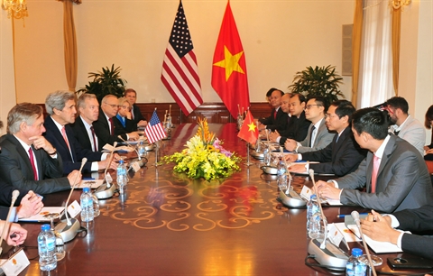 John Kerry a exprimé sa satisfaction de revenir au Vietnam, précisant que les relations entre le Vietnam et les États-Unis étaient un exemple de relations entre anciens ennemis ayant mis de côté le passé pour édifier des relation d'amitié et de partenariat. Il a réaffirmé l'engagement des États-Unis de respecter les institutions politiques, l'indépendance, la souveraineté et l'intégrité du territoire du Vietnam, de le soutenir dans l'organisation du Sommet de l'APEC 2017.