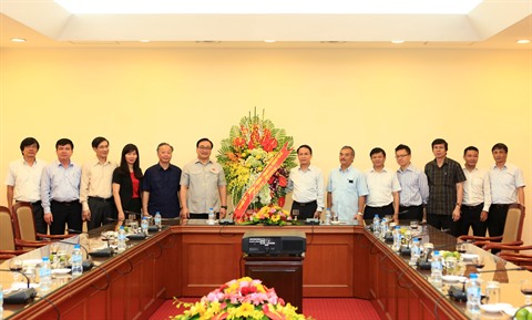 | Le membre du Bureau politique et secrétaire du Comité municipal du Parti pour Hanoï, Hoàng Trung Hai (6e à gauche), et le membre du Comité central du Parti et directeur général de la VNA, Nguyên Duc Loi (7e à droite), le 15 juin à Hanoï. |