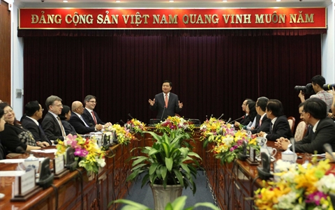| Rencontre entre Dinh La Thang, membre du Bureau politique et secrétaire du Comité du Parti de Hô Chi Minh-Ville, le 23 février, et 25 consuls généraux étrangers dans la mégapole du Sud. |