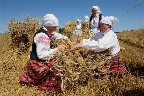 | Les Biélorusse ramasent des blés dans un champ à Yatskovo. |