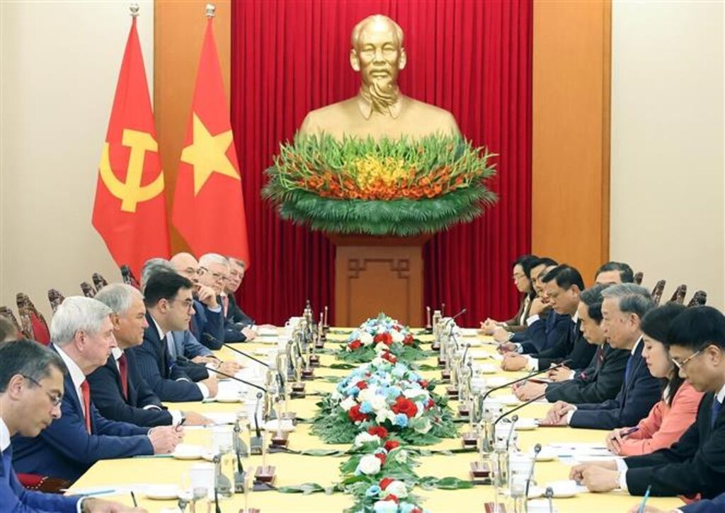 | Lors de la rencontre entre le secrétaire général du Parti, Tô Lâm (3e à droite) et le président de la Douma d’État de Russie (Chambre basse), Viatcheslav Volodine (3e à gauche). |
