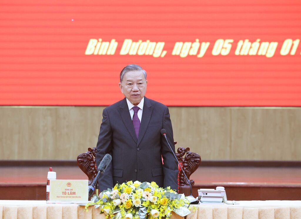 | Le secrétaire général du Parti, Tô Lâm, prend la parole, lors de la séance de travail avec le commandement militaire de la province méridionale de Binh Duong, le 5 janvier. |