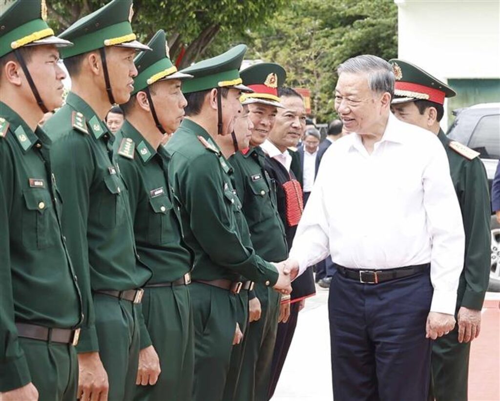 | Le secrétaire général du Parti, Tô Lâm (droite), également secrétaire de la Commission militaire centrale, rencontre les cadres et soldats du poste de garde-frontière d’Ea H’Leo, dans la province de Dak Lak. |