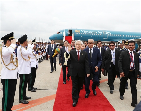 | Le secrétaire général du Parti communiste du Vietnam, Nguyên Phu Trong (centre), le 20 juillet à l’aéroport international de Pochentong de la capitale Phnom Penh. |