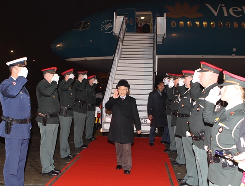 | Le secrétaire général du PCV, Nguyên Phu Trong (centre), est arrivé le 17 janvier à l'aéroport militaire de Bruxelles |